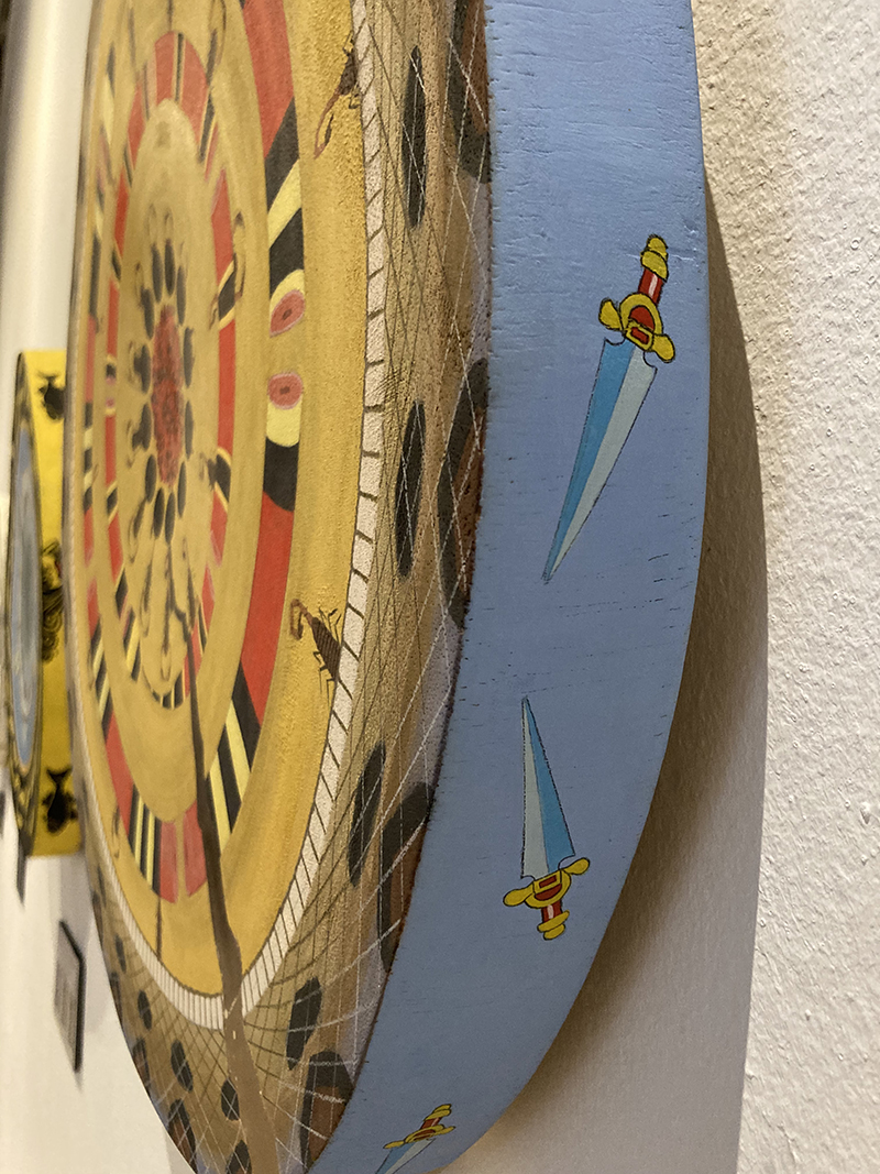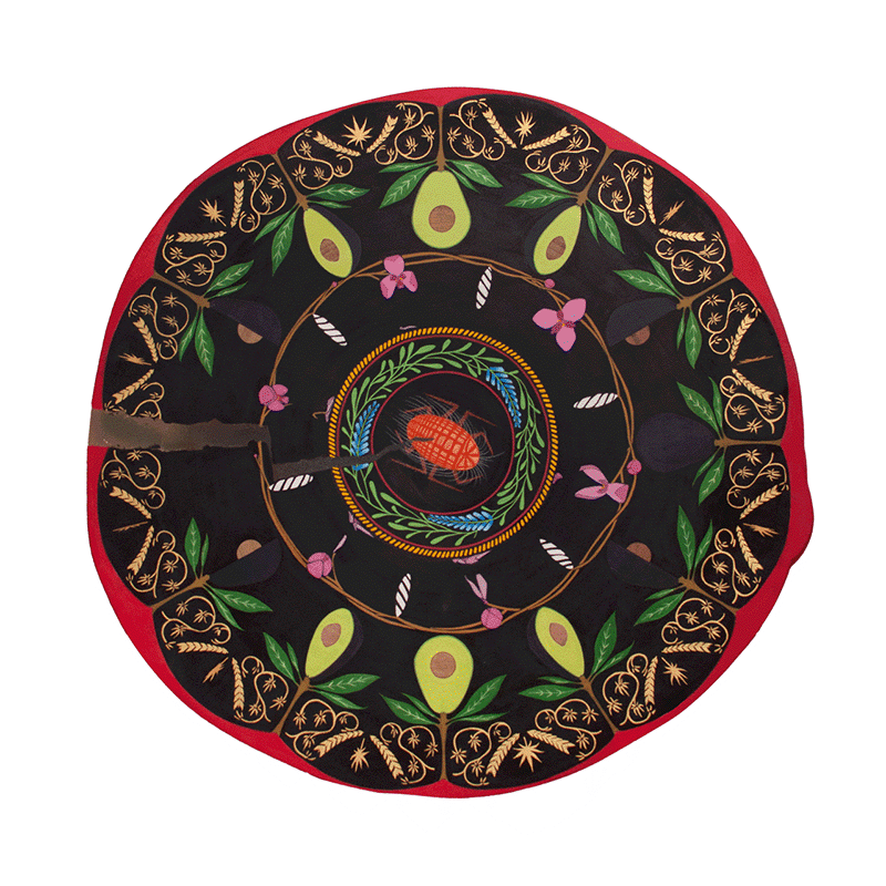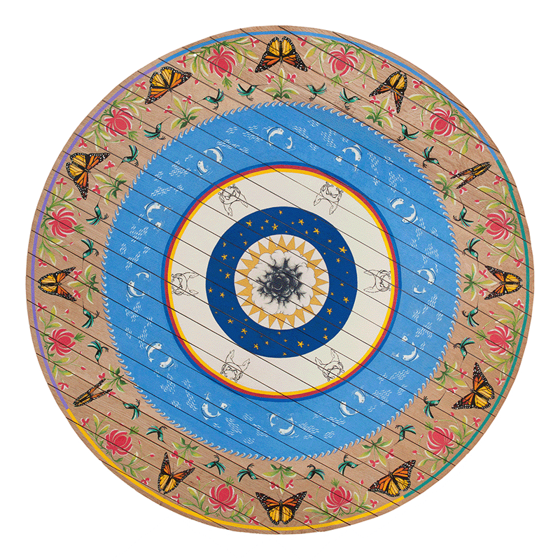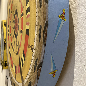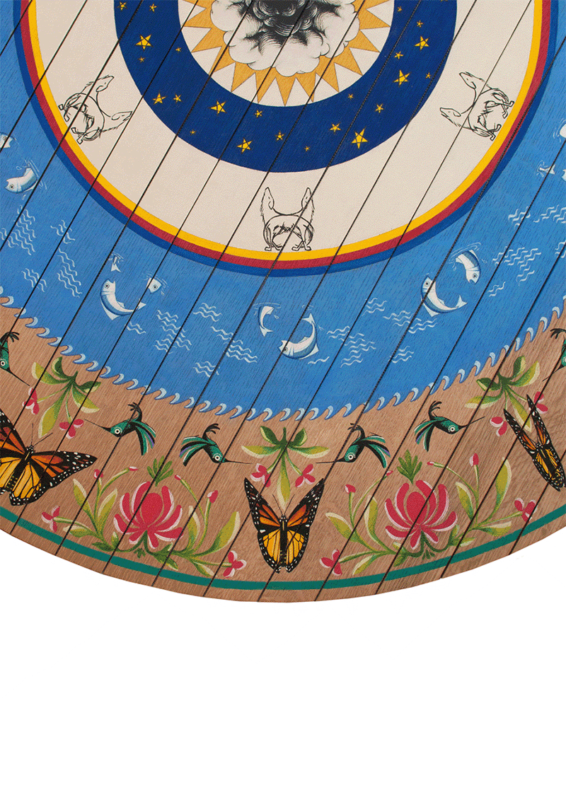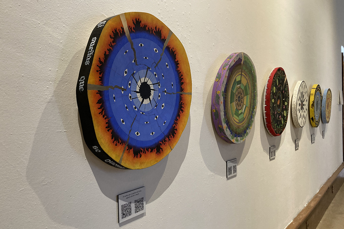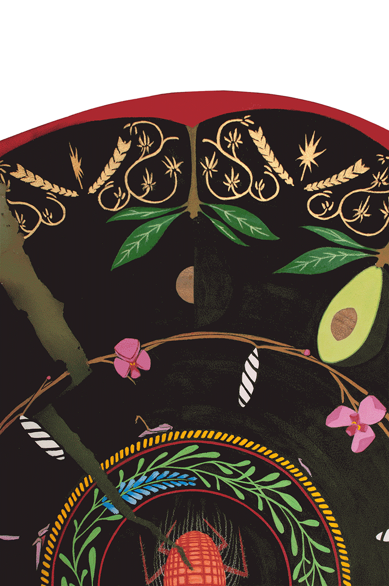 Artistic commission for the XIV FEMSA Biennial Inestimable azar, which consisted of the production of a series of 12 paintings in gouache on broken slices of huanacaxtle (or parota) wood, whose surface, slightly concave as trays - or bateas: popular ornamental plates-, contained contemporary stories of conflict from the Michoacán region in concentric circles as omens with Purépecha sentences. Accompanied by a QR code, a rotating disc in motion with an animation hidden among the paintings is revealed.