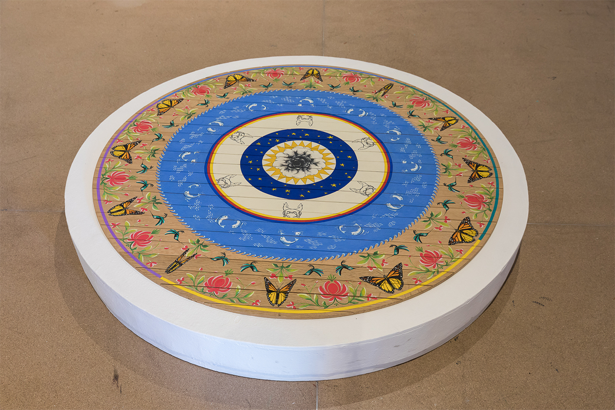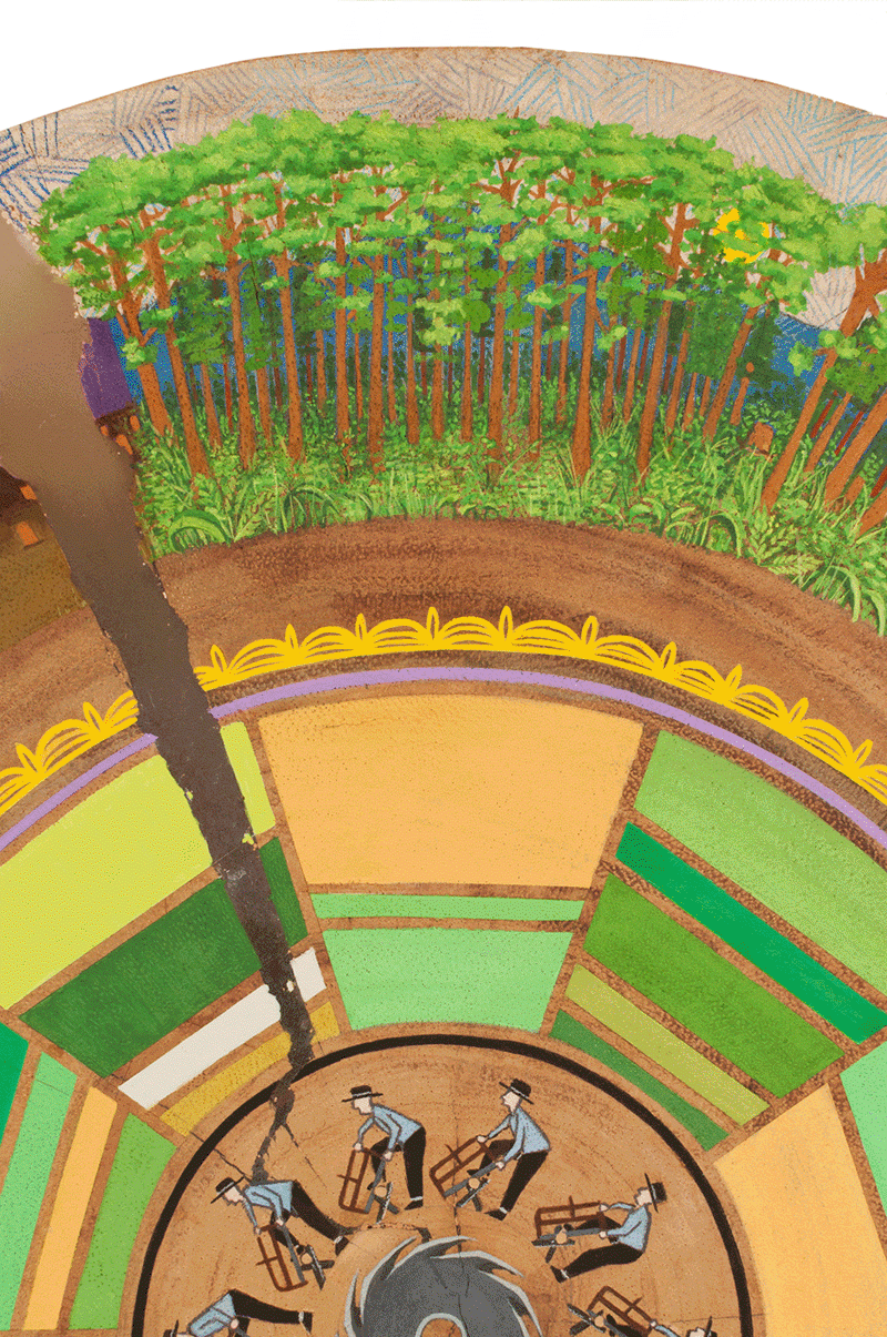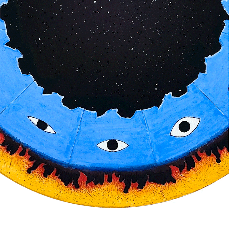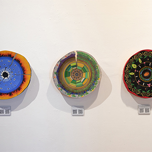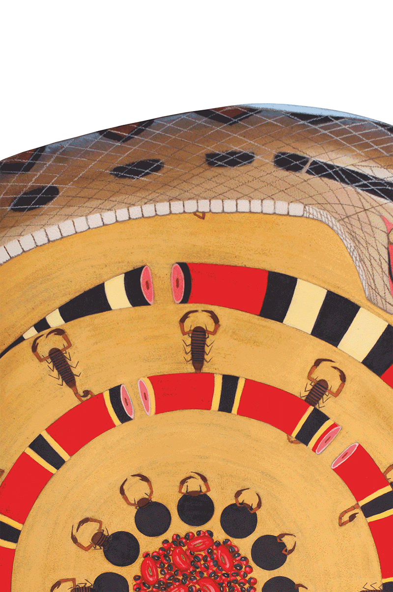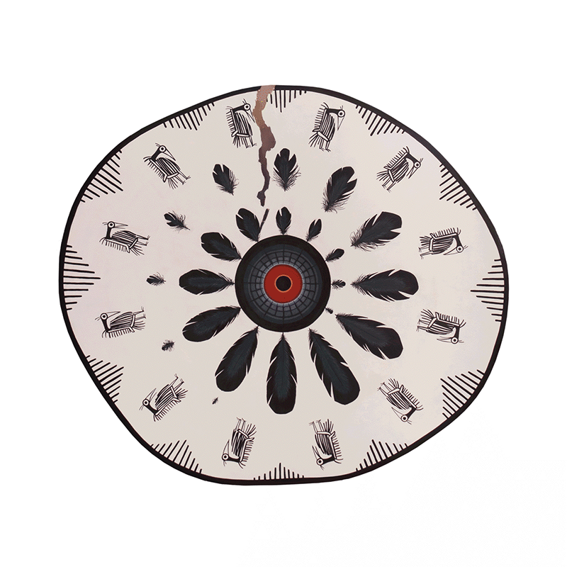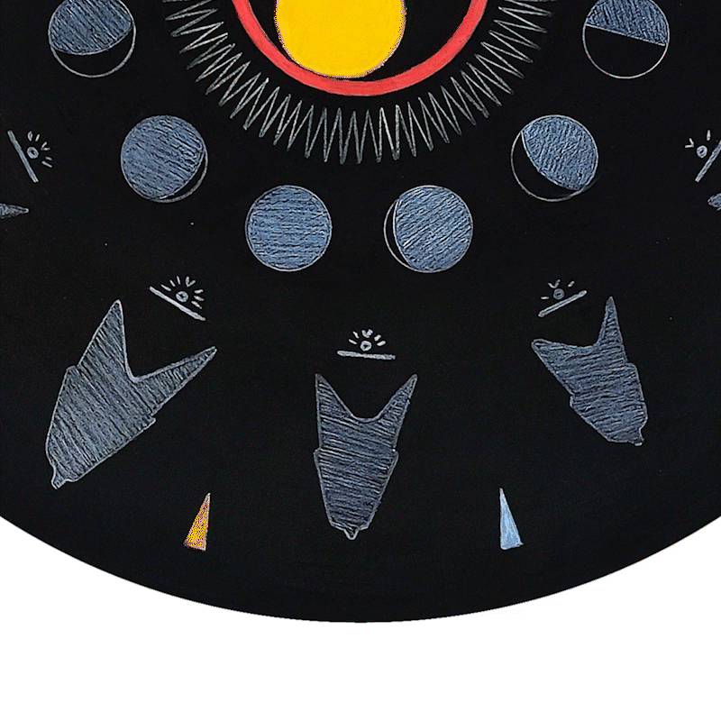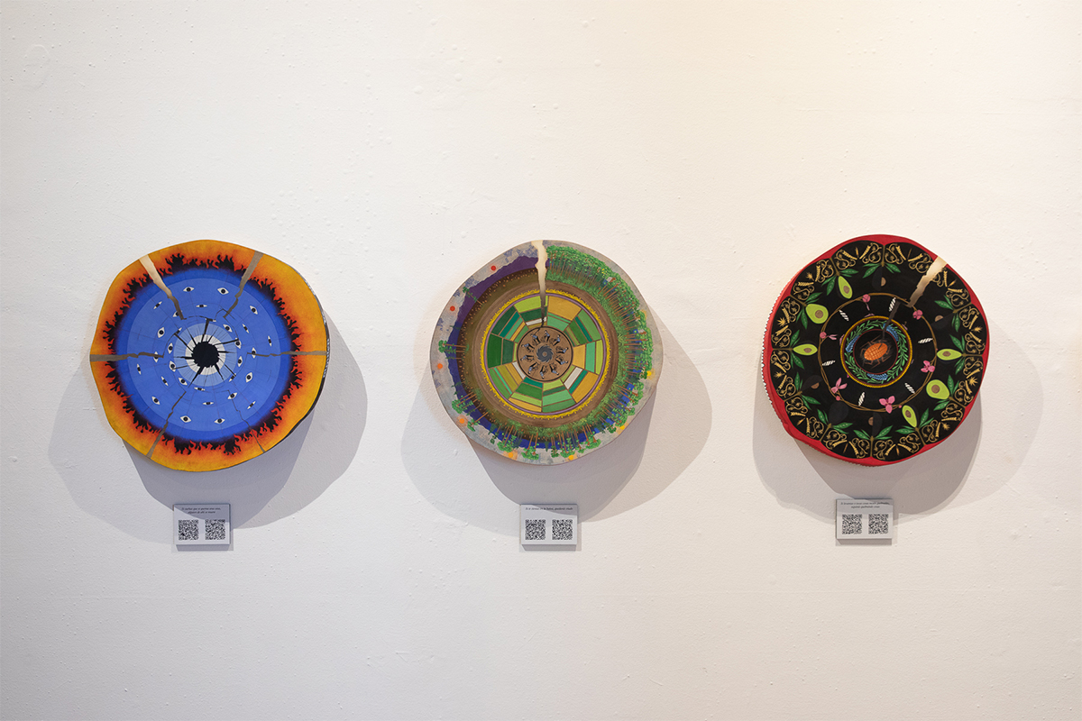 Artistic commission for the XIV FEMSA Biennial Inestimable azar, which consisted of the production of a series of 12 paintings in gouache on broken slices of huanacaxtle (or parota) wood, whose surface, slightly concave as trays - or bateas: popular ornamental plates-, contained contemporary stories of conflict from the Michoacán region in concentric circles as omens with Purépecha sentences. Accompanied by a QR code, a rotating disc in motion with an animation hidden among the paintings is revealed.