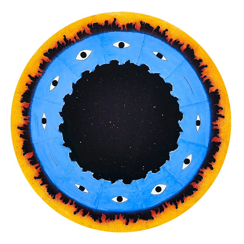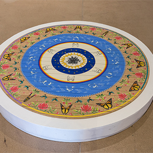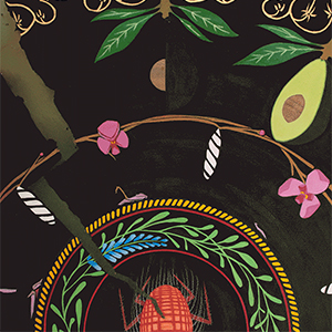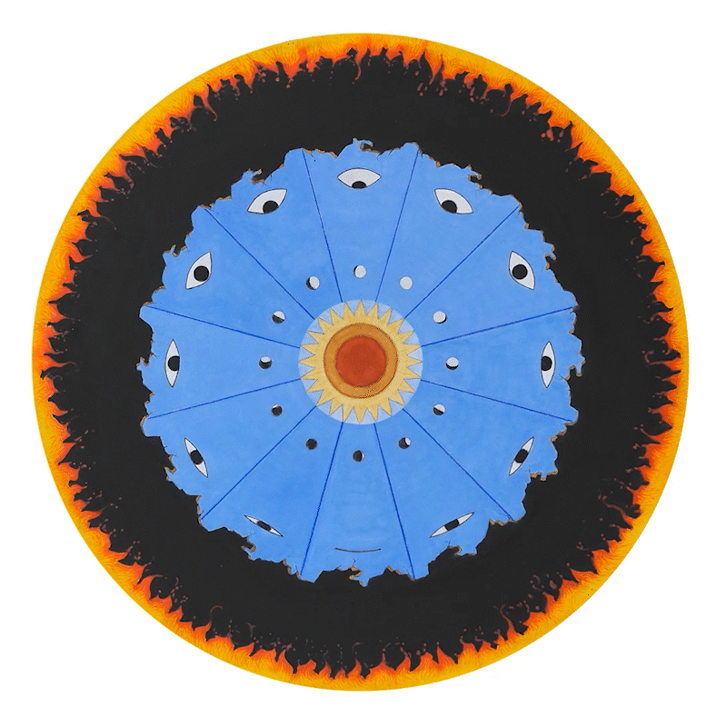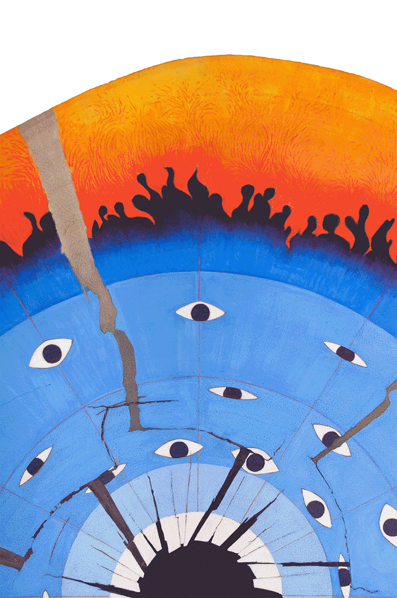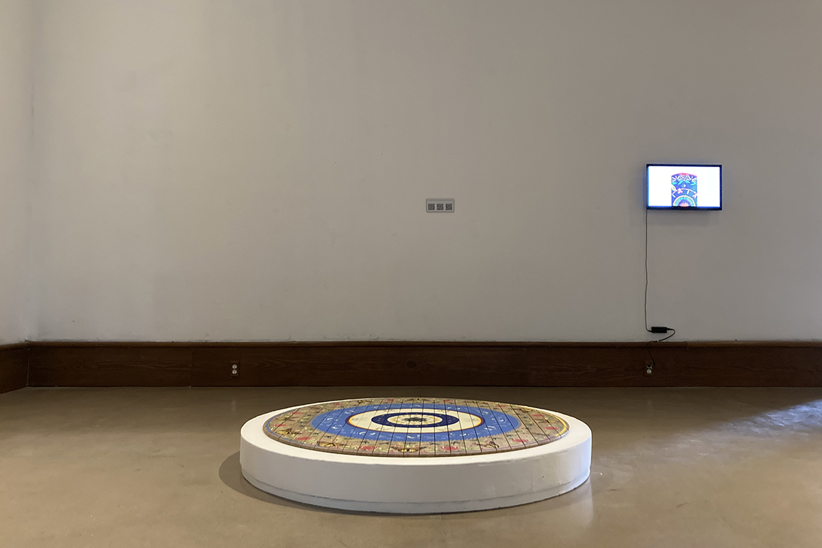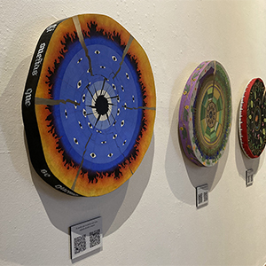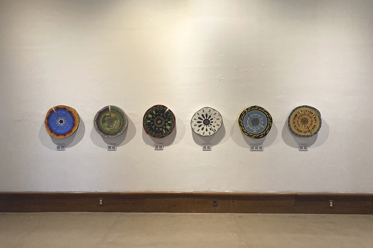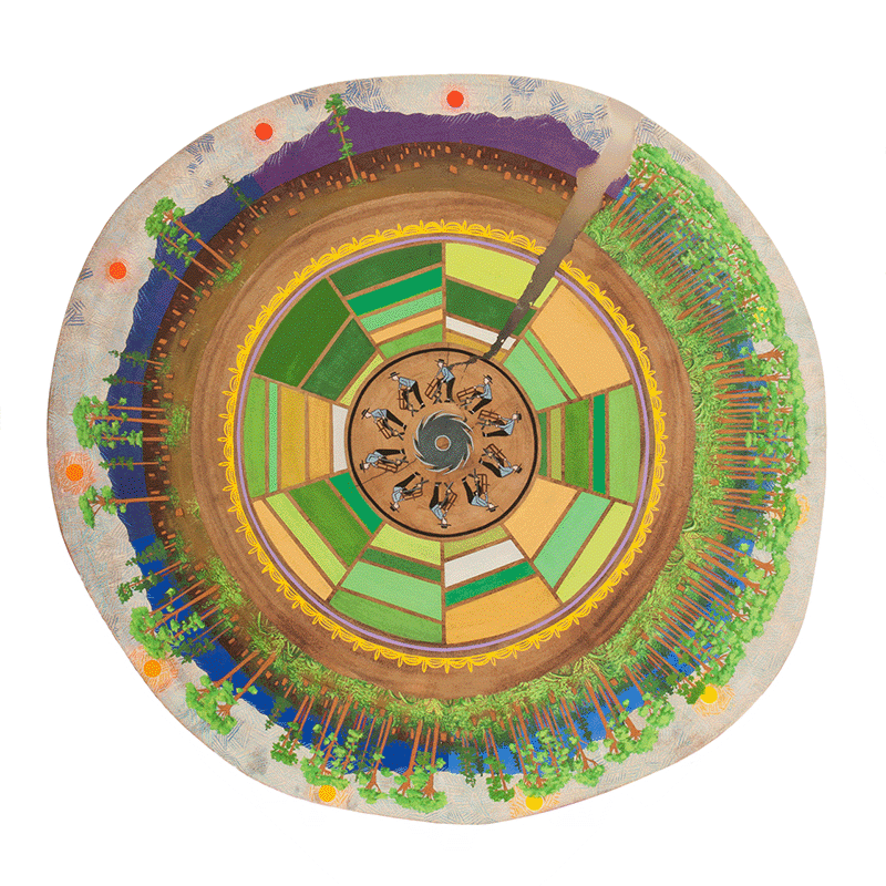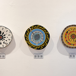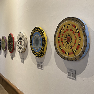 Artistic commission for the XIV FEMSA Biennial Inestimable azar, which consisted of the production of a series of 12 paintings in gouache on broken slices of huanacaxtle (or parota) wood, whose surface, slightly concave as trays - or bateas: popular ornamental plates-, contained contemporary stories of conflict from the Michoacán region in concentric circles as omens with Purépecha sentences. Accompanied by a QR code, a rotating disc in motion with an animation hidden among the paintings is revealed.