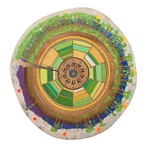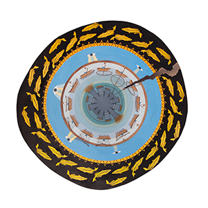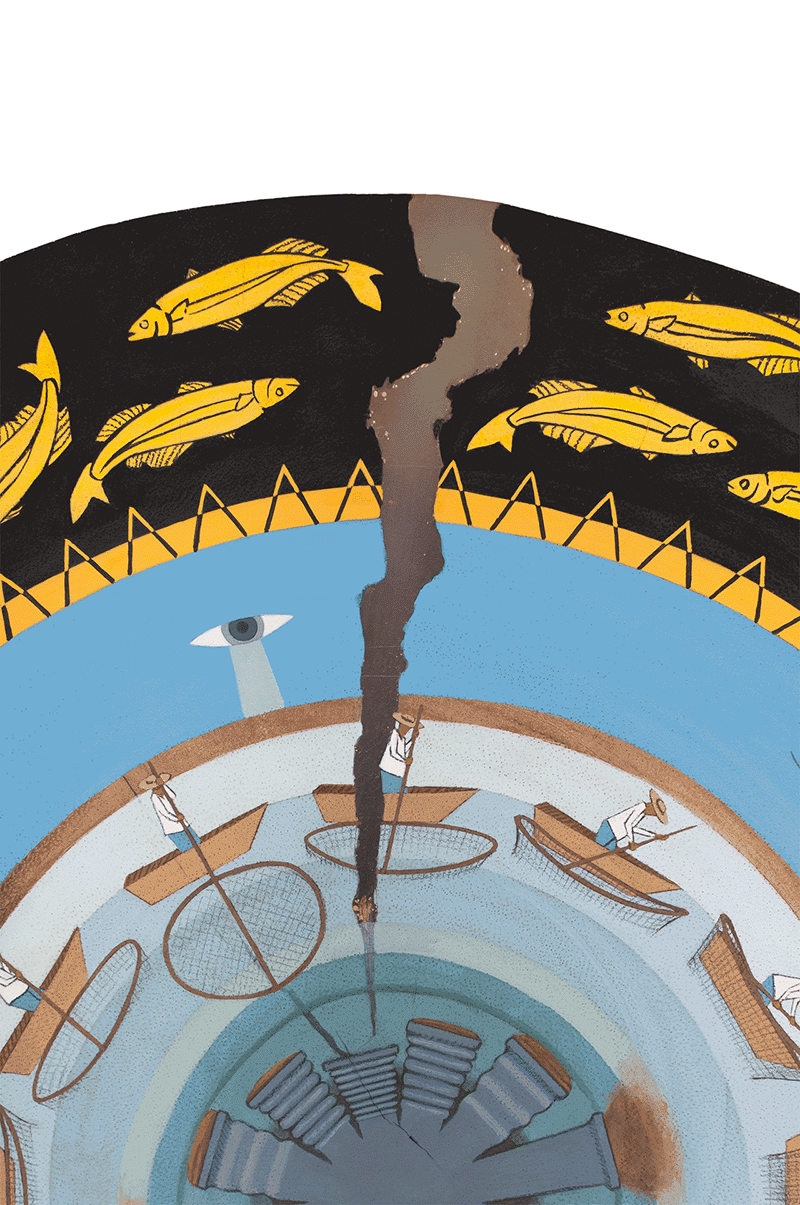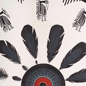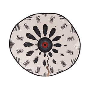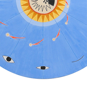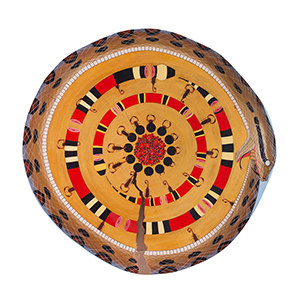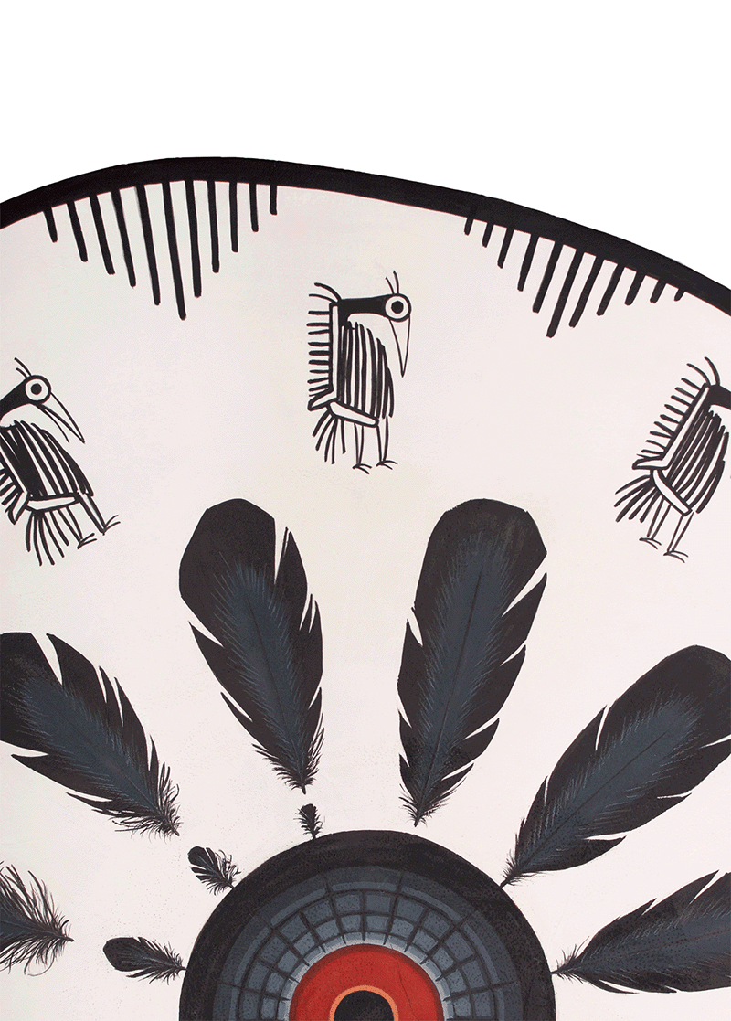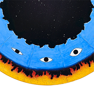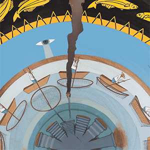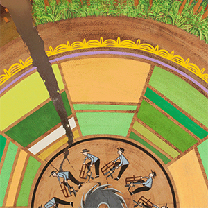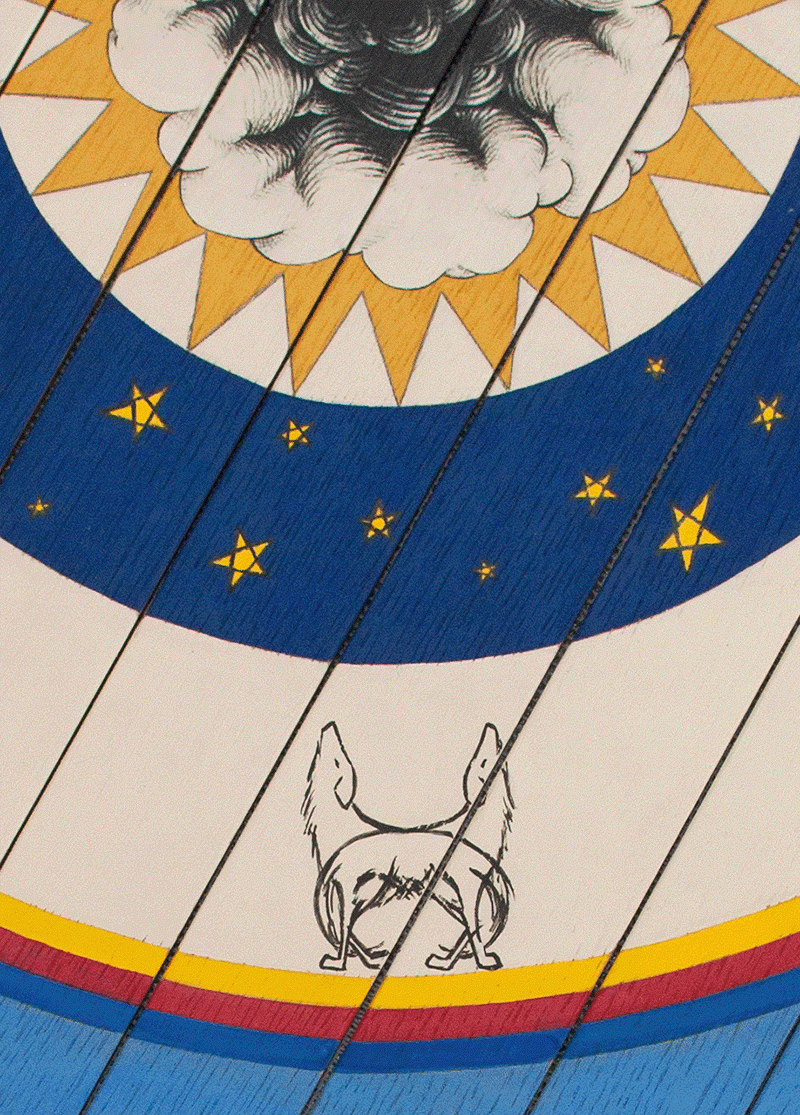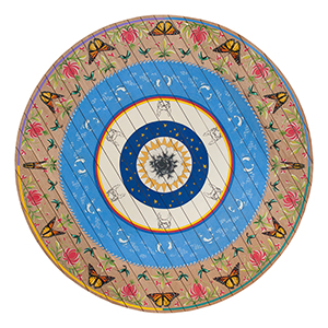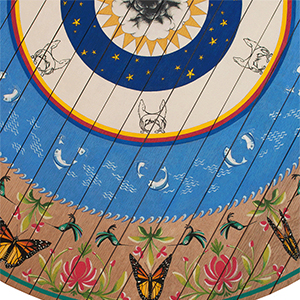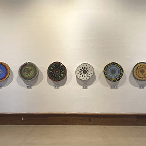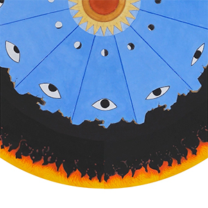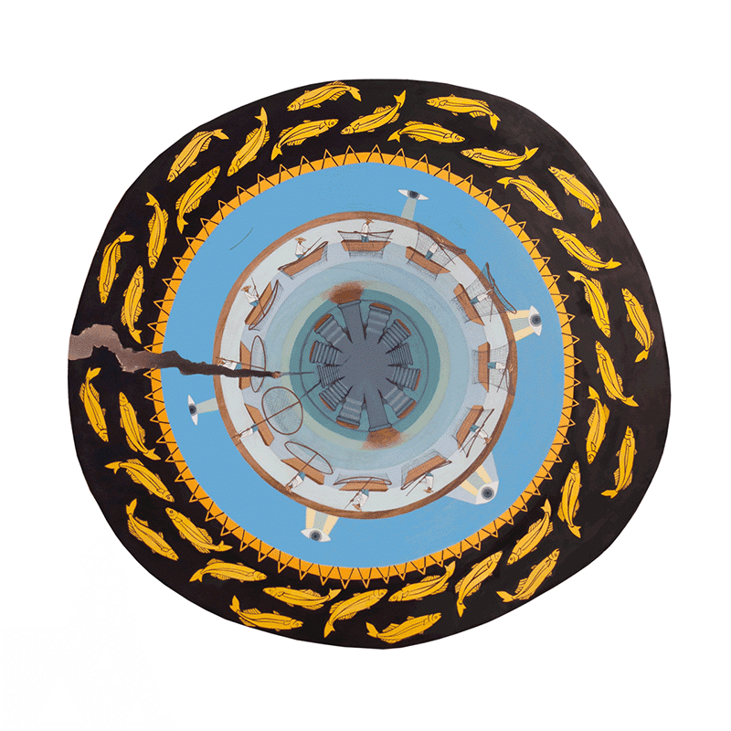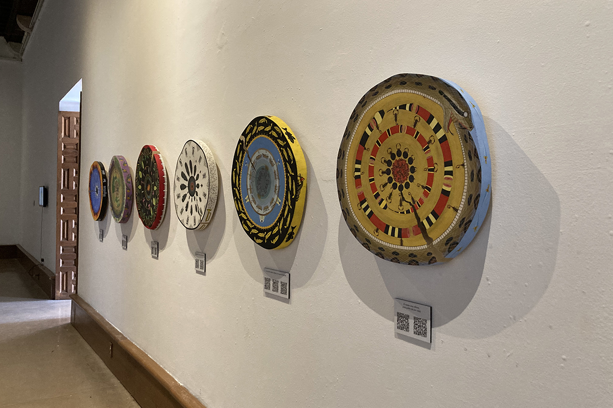 Artistic commission for the XIV FEMSA Biennial Inestimable azar, which consisted of the production of a series of 12 paintings in gouache on broken slices of huanacaxtle (or parota) wood, whose surface, slightly concave as trays - or bateas: popular ornamental plates-, contained contemporary stories of conflict from the Michoacán region in concentric circles as omens with Purépecha sentences. Accompanied by a QR code, a rotating disc in motion with an animation hidden among the paintings is revealed.