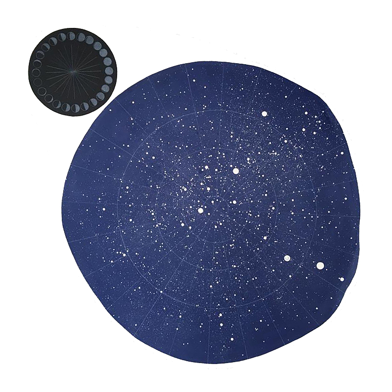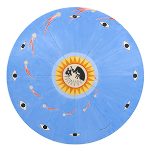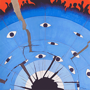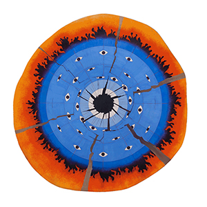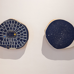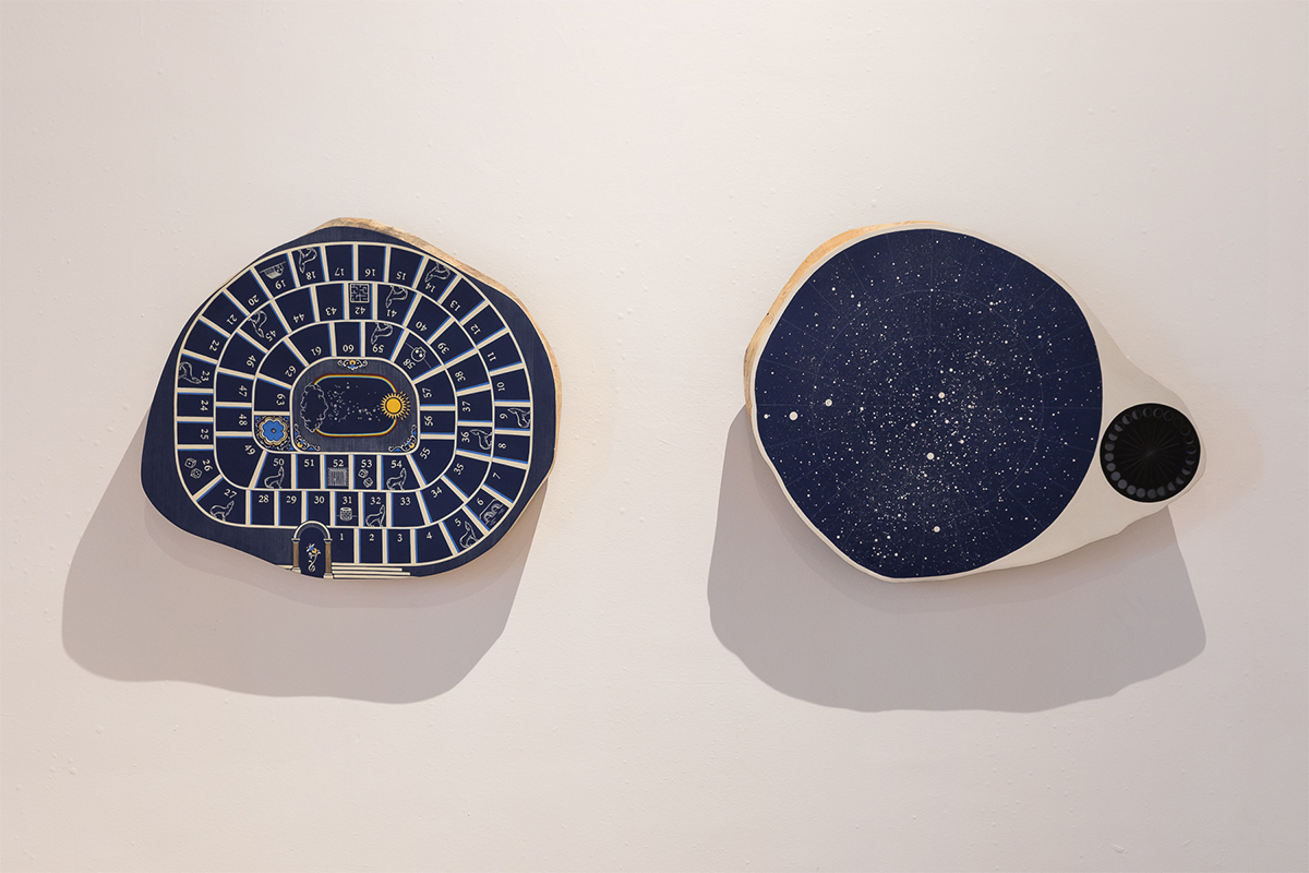 Comisión artística para la XIV Bienal FEMSA Inestimable azar. La serie Agüeros consistió en la producción de una serie de 12 pinturas en gouache sobre rodajas quebradas de madera de huanacaxtle (o parota), cuya superficie, ligeramente cóncava a modo de bateas -o peribanas: platos ornamentales populares-, contenía relatos contemporáneos de la zona de Michoacán, México en círculos concéntricos encriptados a modo de presagios con sentencias purépechas. Acompañadas de un código QR, las pinturas se imponen como un disco giratorio cuya animación revela ciclos de devastación que inundan la región.