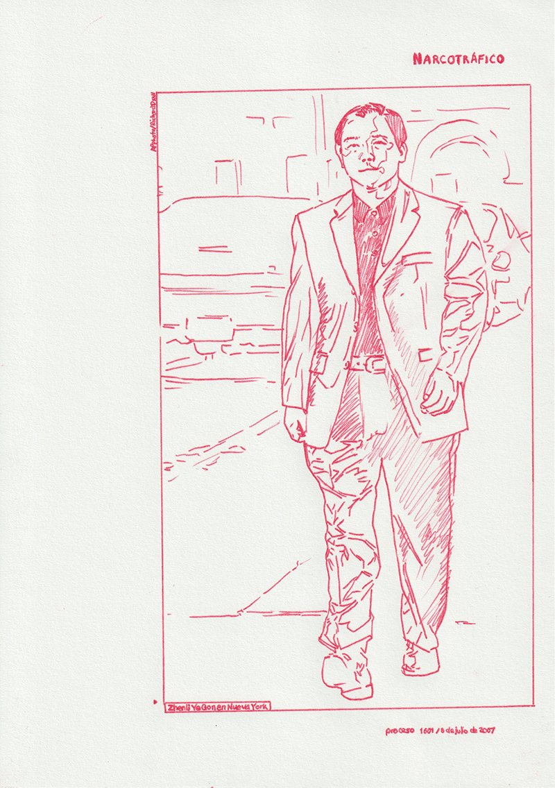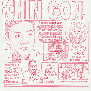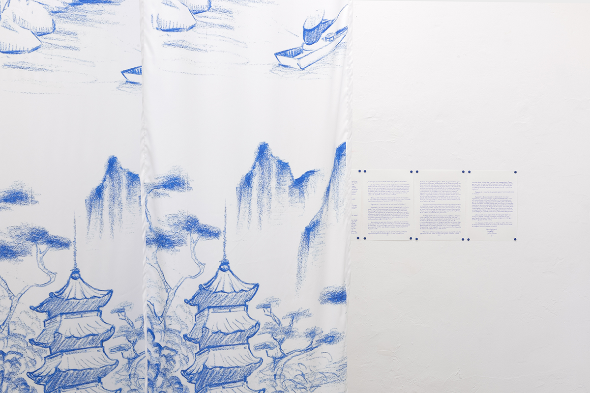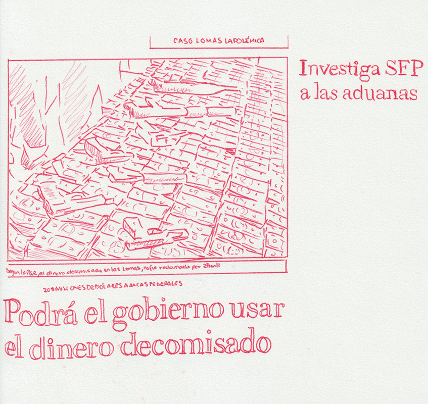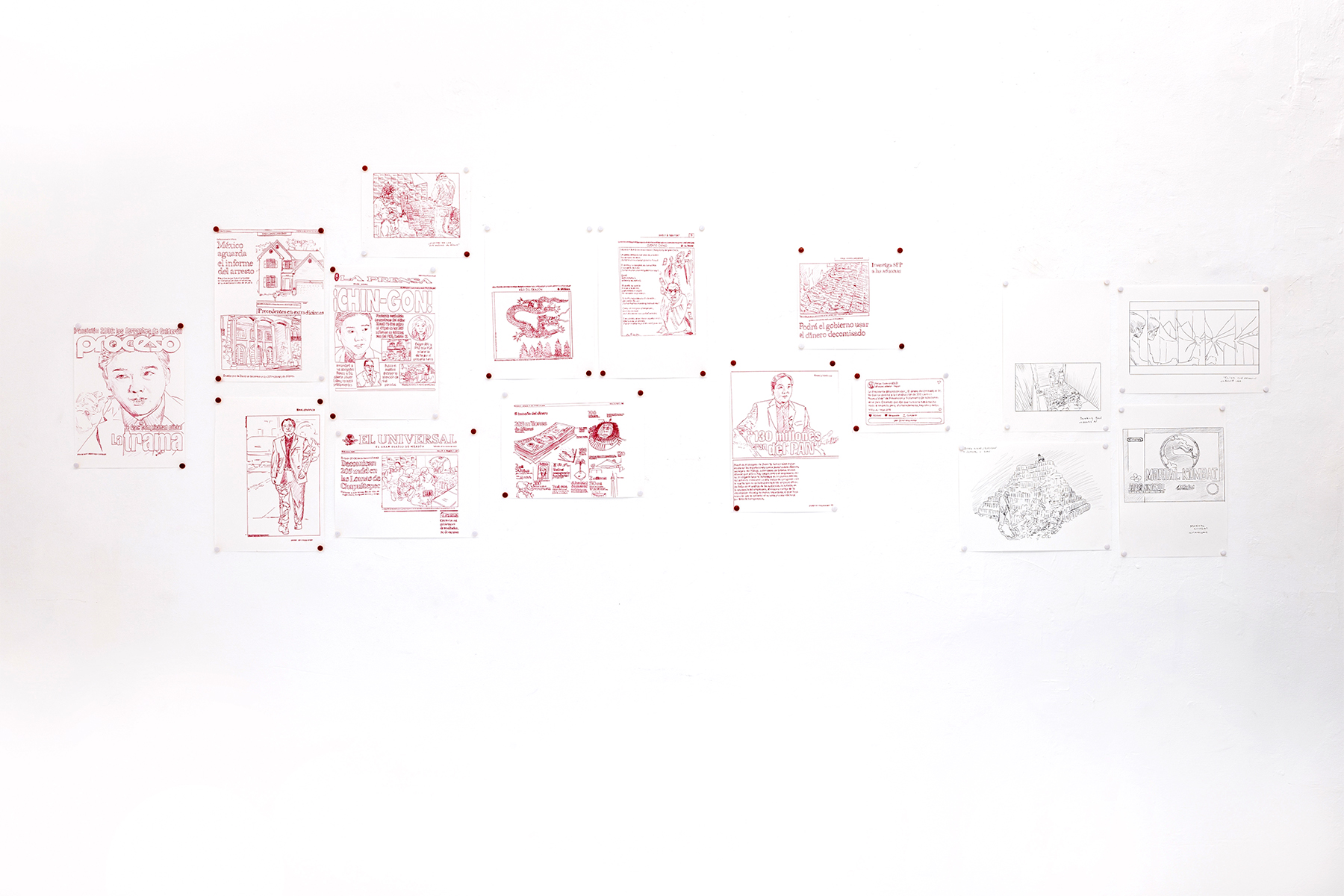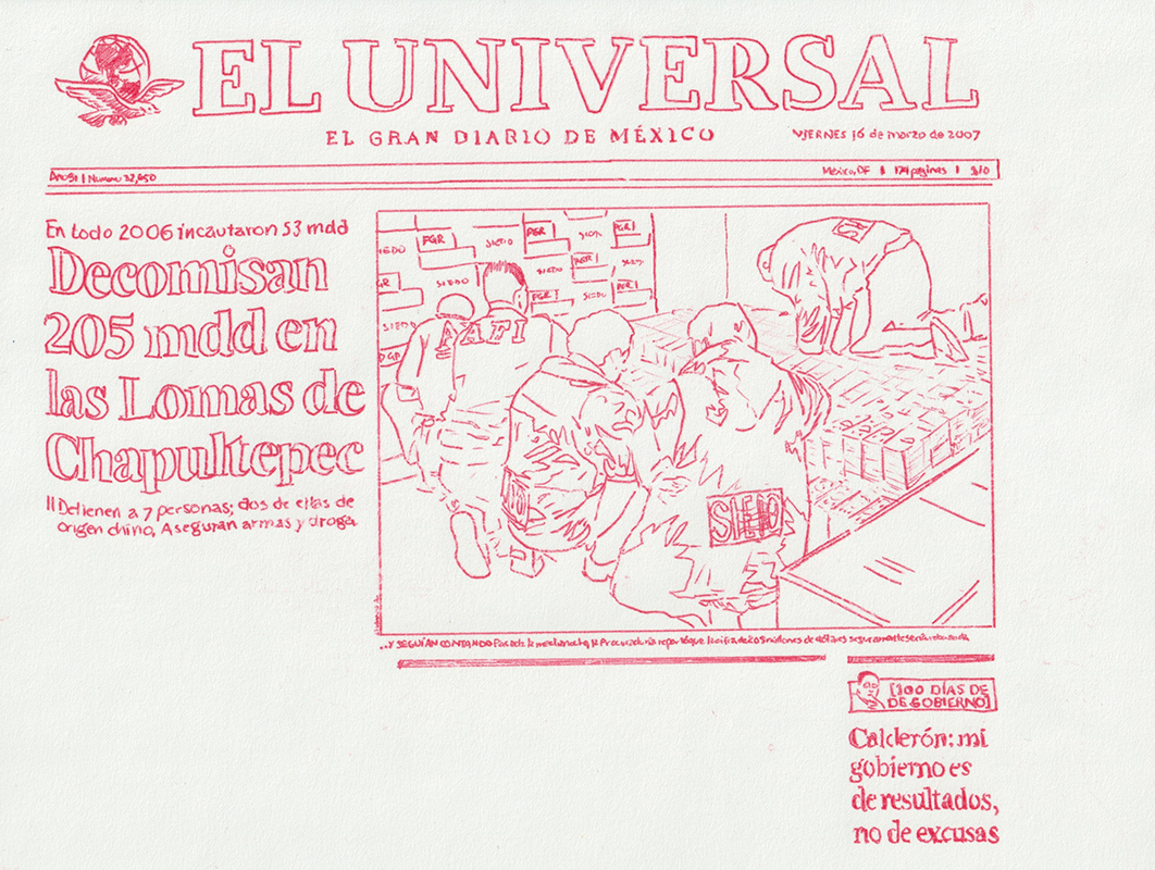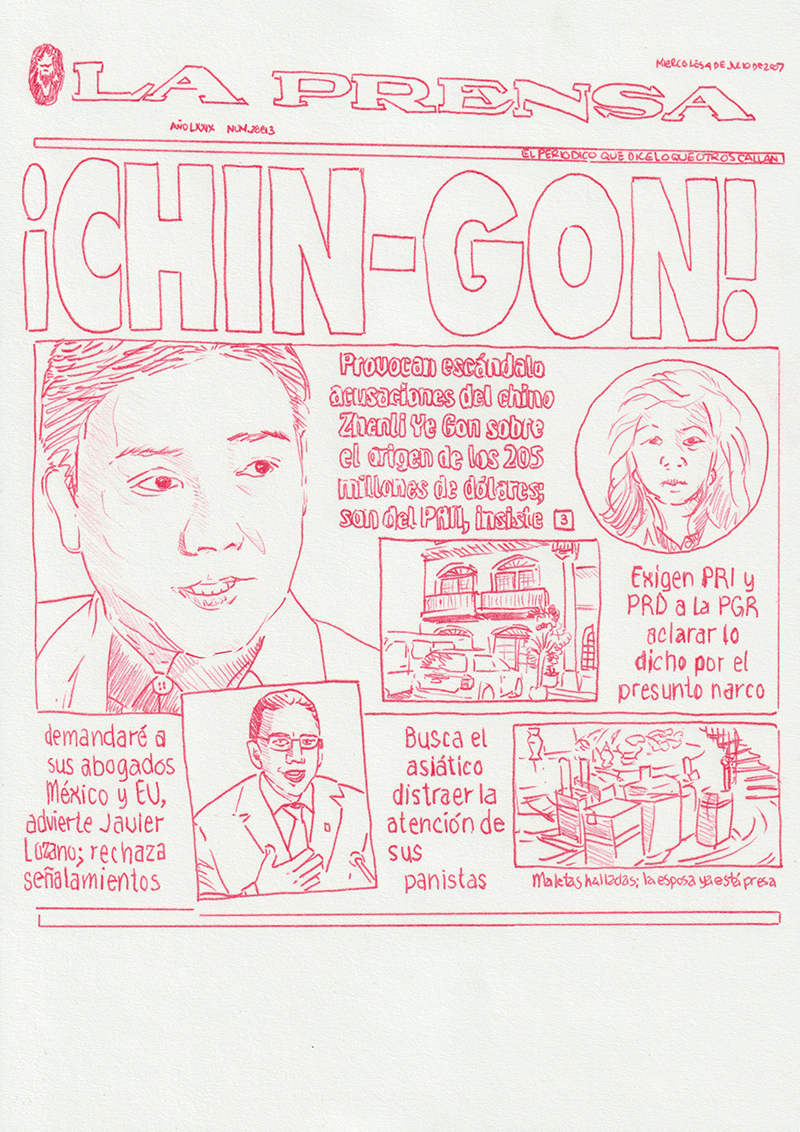 Based on a personal newspaper archive, En un bosque de la China (In a forest of China) is a network of allegories —a graphic and pictorial mapping made with cardboard and carbon paper— about cultural reproduction and the wear and tear of the popular imaginary about China in Mexico through the criminal operative Operación Dragón* (Dragon Operation), a 2007 police operation against Zhenli Ye Gon, a pharmaceutical magnate accused of drug trafficking. More than 205 million dollars were seized —among other luxury items— were found in his mansion located in Lomas de Chapultepec in Mexico City, It was the largest cash seizure in the history of Mexico during the war on drugs, which took place under during Felipe Calderón´s six-year presidential term. In comic and surreal ways, the case revealed a series of controversies, acts of corruption, paraphrased racism and millionaire leaks that still echo to this day.