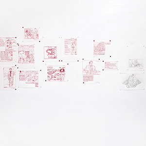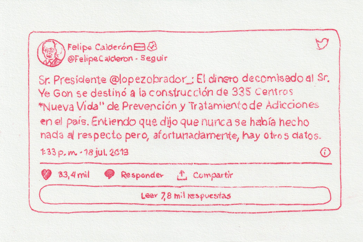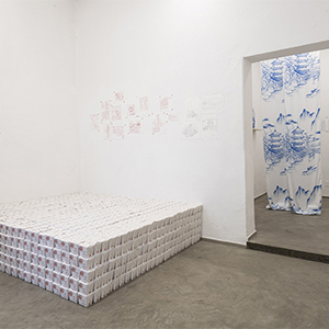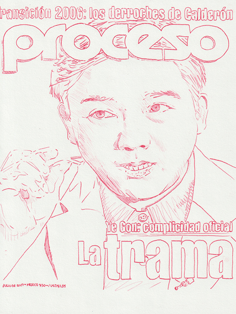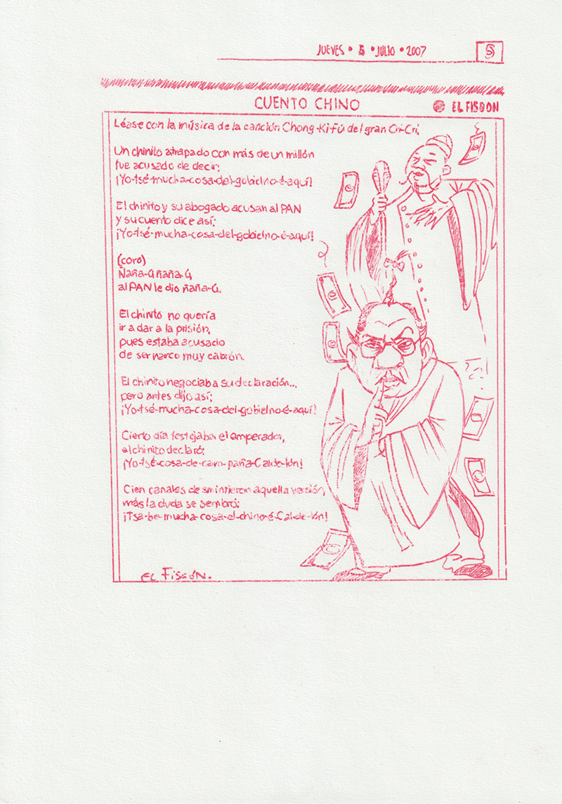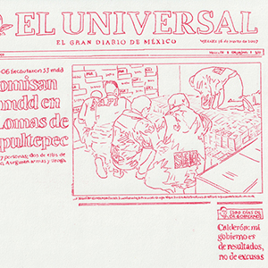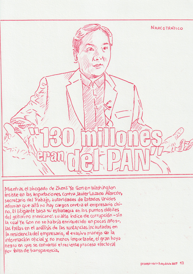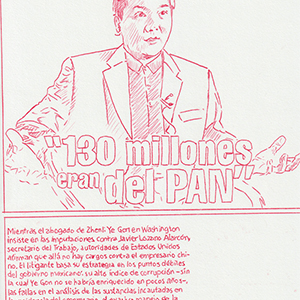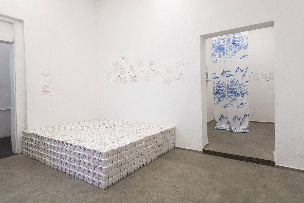 Based on a personal newspaper archive, En un bosque de la China (In a forest of China) is a network of allegories —a graphic and pictorial mapping made with cardboard and carbon paper— about cultural reproduction and the wear and tear of the popular imaginary about China in Mexico through the criminal operative Operación Dragón* (Dragon Operation), a 2007 police operation against Zhenli Ye Gon, a pharmaceutical magnate accused of drug trafficking. More than 205 million dollars were seized —among other luxury items— were found in his mansion located in Lomas de Chapultepec in Mexico City, It was the largest cash seizure in the history of Mexico during the war on drugs, which took place under during Felipe Calderón´s six-year presidential term. In comic and surreal ways, the case revealed a series of controversies, acts of corruption, paraphrased racism and millionaire leaks that still echo to this day.