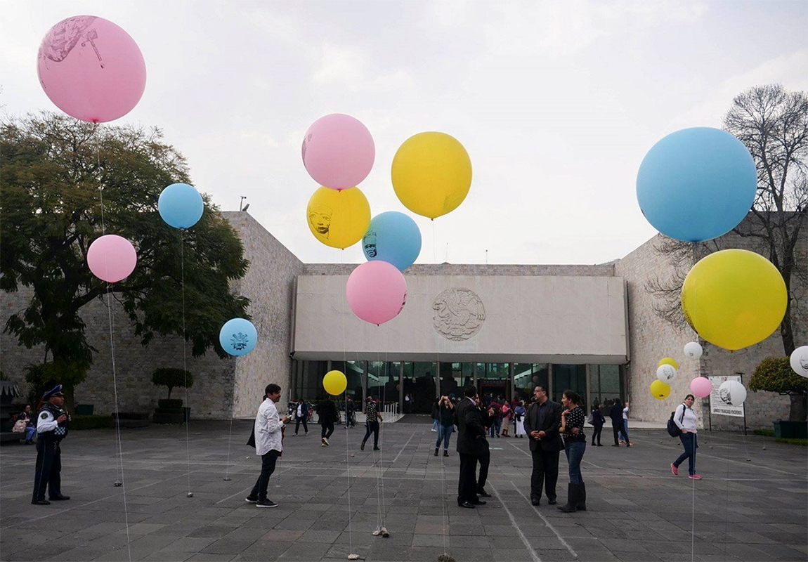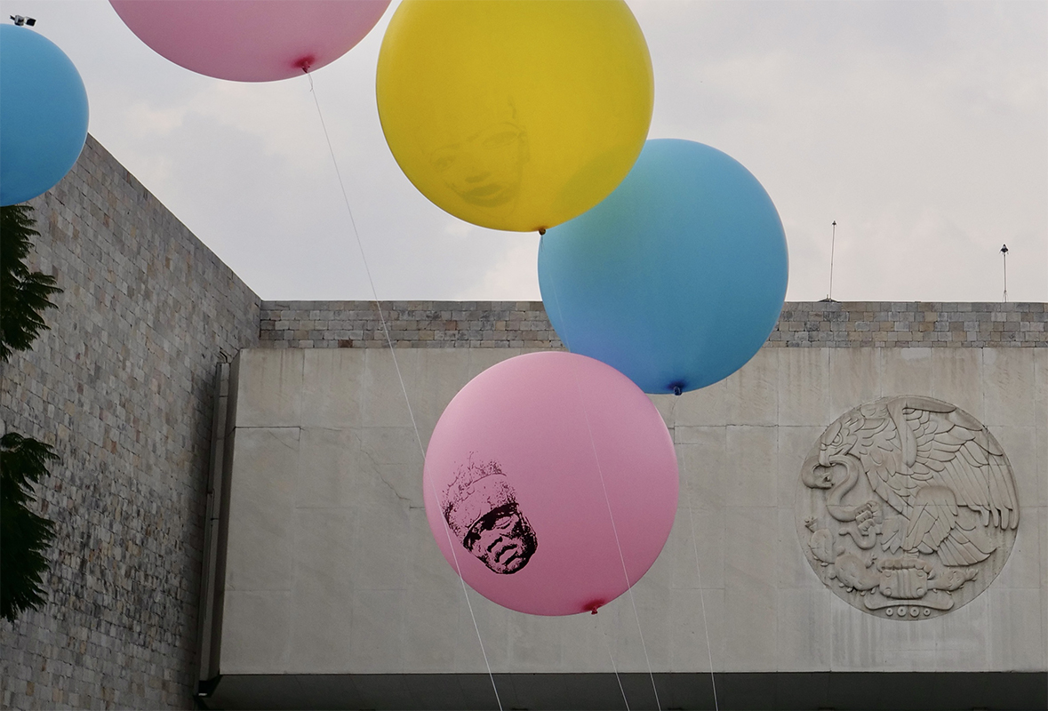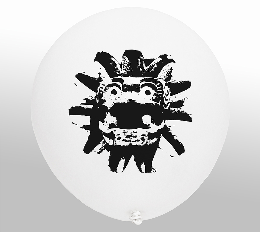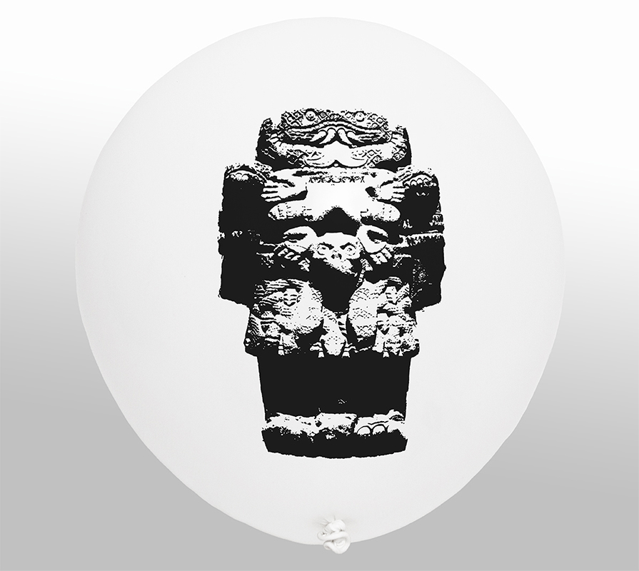 This new collection of objects based on plastic and air establishes a symbolic relationship with the material where said installation appeals to the physical instability of the pieces through the inflatable sculpture, which, reproducing the image of works of pre-Hispanic art on filled balloons of air, contrasts with the materiality of the authentic pieces, which are mostly made of stone, glass or clay.