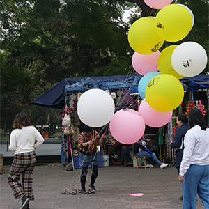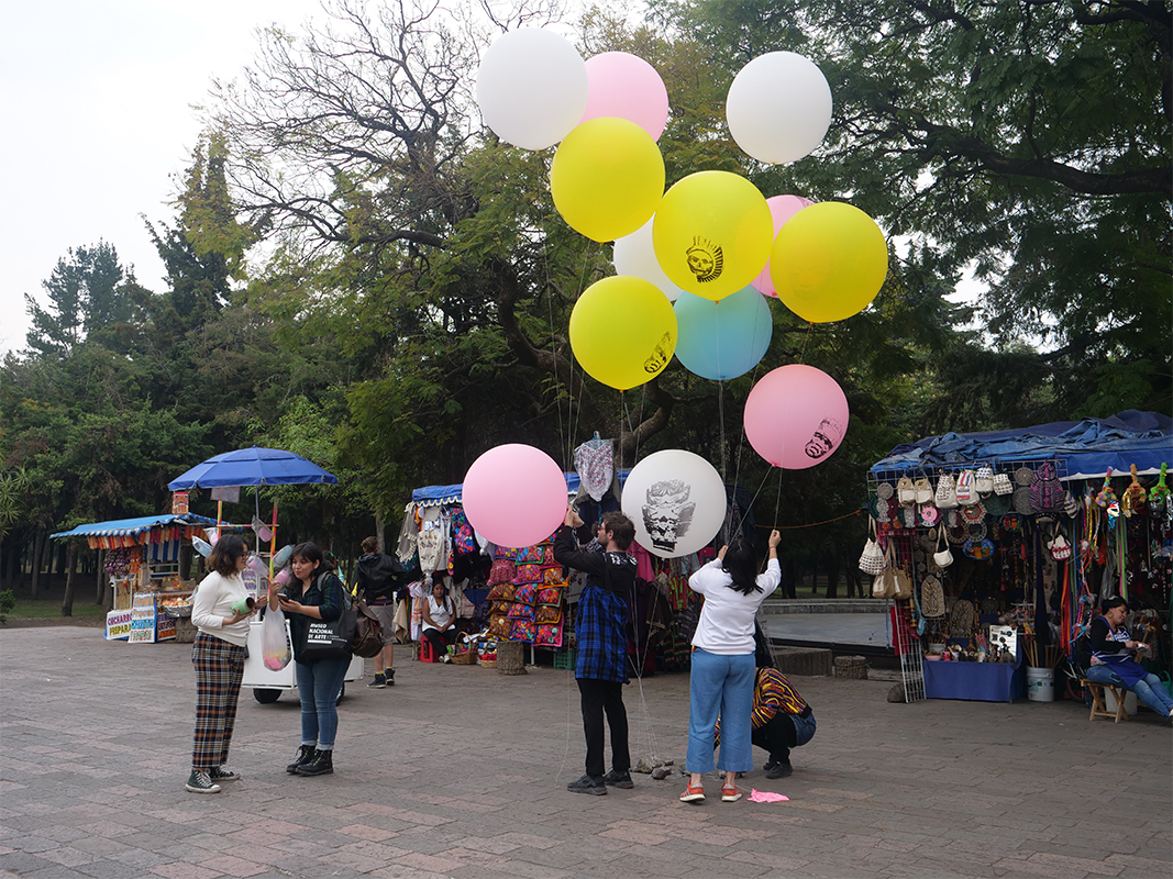 Nueva colección prehispánica de danza aérea (New pre-Hispanic Aerial Dance Collection) seeks to put in crisis, through a playful act, the concepts of conservation and cultural heritage that give rise to national identity, an identity that is built on the archaeological ruin that has been the result of looting and violence of the colonial historical process. This project takes the collection out of the museum and returns it to an everyday context through the creation of new popular, portable and economical objects, subverting the solemnity of the pieces in the museum through material of a festive nature (influenced by the local trade of the area that is supported by plastic) and that is distributed free of charge among passers-by outside the museum. At the same time, the multiple reproductions recall the idea of the souvenir, trying to smooth out the dichotomous notion of originals/fakes, as well as eliminate the implicit distance that these objects keep within the museum and the viewer.